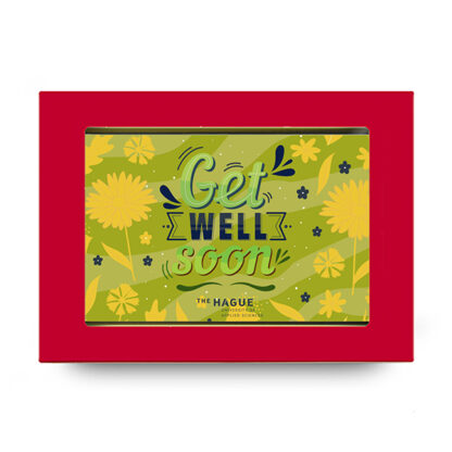 Een rode vensterdoos voorzien van een melkchocolade wenskaart (150 gram) en een marsepeinen laagje (25gram) met de tekst GET WELL SOON en jouw bedrijfslogo. Het marsepeinen laagje wordt met cacaoboter bevestigd, waardoor het geschenk één geheel wordt. De chocolade is gemaakt van onze eigen duurzame (Cocoa Horizons) chocoladerecepten van het Belgische topmerk Barry Callebaut.