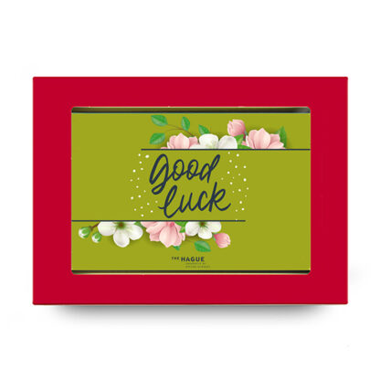 Een rode vensterdoos voorzien van een melkchocolade wenskaart (150 gram) en een marsepeinen laagje (25gram) met de tekst GOOD LUCK en jouw bedrijfslogo. Het marsepeinen laagje wordt met cacaoboter bevestigd op de melkchocolade, waardoor het geschenk één geheel wordt. De chocolade is gemaakt van onze eigen duurzame (Cocoa Horizons) chocoladerecepten van het Belgische topmerk Barry Callebaut.