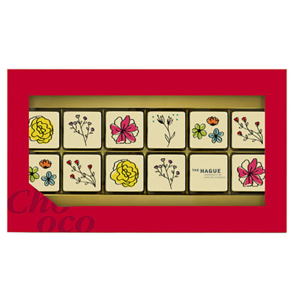 Red giftbox with 12 logo chocolates | Cocoa Horizons-Certified milk and with chocolate couverture from the Belgian top brand Barry Callebaut | In full color we can print any design, image or logo | More than 1 logo per giftbox: + 10% fee |Order quantity > 9.600 pieces, price on request | Available in multiples of 40 pieces | Fast delivery | Personalized box possible from 500 pieces | Setup costs for free!