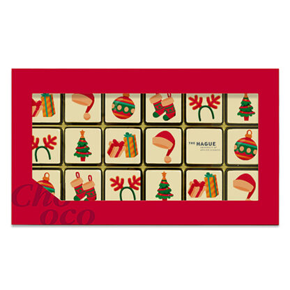 Maar liefst 18 overheerlijke chocolaatjes verpakt in een mooie luxe vensterdoos. Een originele verrassing voor collega’s, medewerkers of relaties. De chocolaatjes bestaan uit een laagje melk- en witte chocolade en zijn gemaakt van onze eigen duurzaam geproduceerde (Cocoa Horizons) chocoladerecepten van het Belgische topmerk Barry Callebaut.