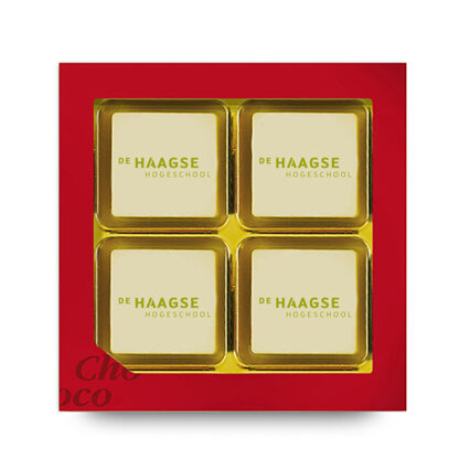 Red giftbox with 4 logo pralines | Handmade pralines of Cocoa Horizons-Certified white chocolate from the Belgian top brand Barry Callebaut, richly provided with a high-quality hazelnut praline filling | In full color we can print any design, image or logo | More than 1 logo per giftbox: + 10% fee |Order quantity > 9.600 pieces, price on request | Available in multiples of 60 pieces | Fast delivery | Personalized box possible from 500 pieces | Setup costs for free!