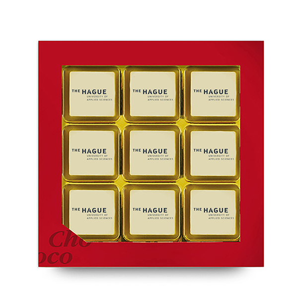 Red giftbox with 9 logo pralines | Handmade pralines of Cocoa Horizons-Certified white chocolate from the Belgian top brand Barry Callebaut, richly provided with a high-quality hazelnut praline filling | In full color we can print any design, image or logo | More than 1 logo per giftbox: + 10% fee |Order quantity > 9.600 pieces, price on request | Available in multiples of 60 pieces | Fast delivery | Personalized box possible from 500 pieces | Setup costs for free!