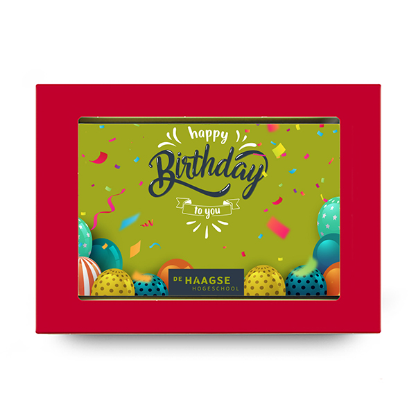 Een rode vensterdoos voorzien van een melkchocolade wenskaart (150 gram) en een marsepeinen laagje (25gram) met de tekst HAPPY BIRTHDAY en het HHS logo. Het marsepeinen laagje wordt met cacaoboter bevestigd, waardoor het geschenk één geheel wordt. De chocolade is gemaakt van onze eigen duurzame (Cocoa Horizons) chocoladerecepten van het Belgische topmerk Barry Callebaut.