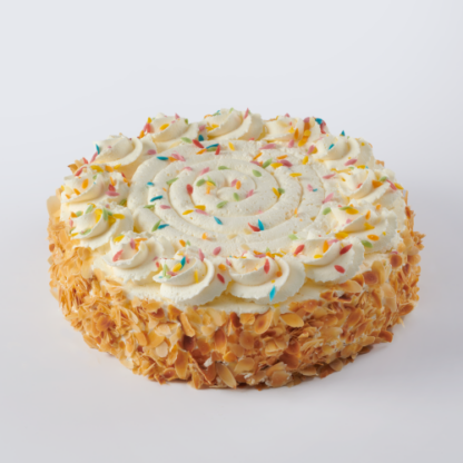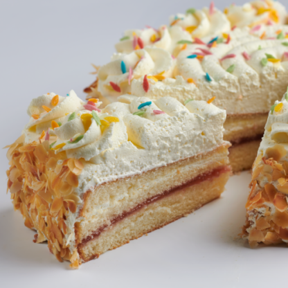 Trakteer je familie, vrienden of collega’s op deze ronde slagroomtaart. Deze heerlijke slagroomtaart voor 8 of 12 personen bestaat uit een zachte cake, romige slagroom met een frisse, fruitige vulling en is feestelijk versierd met gekleurde chocolade confetti. De ronde vorm van de taart geeft een gevoel van elegantie en gezelligheid, terwijl de slagroom een heerlijke zoetheid biedt. De taart is een geweldige keuze voor verjaardagen of andere viermomenten, of gewoon als een lekkere traktatie om te delen met vrienden, familie of collega’s. Kortom een echte delicatesse voor elke gelegenheid, bereid met ingrediënten van hoogwaardige kwaliteit.