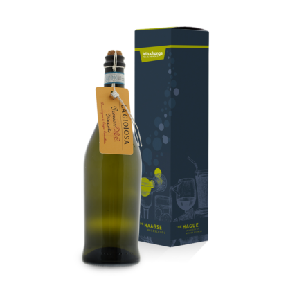 Luxueuze wijndoos met een heerlijke Prosecco: La Gioiosa Prosecco Frizzante Filo (0.75L). De doos is speciaal gemaakt in de stijl van uw bedrijf.